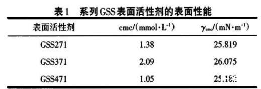 由表1可知,3種表面活性劑中GSS471的cmc較小,GSS271的cmc與之接近,GSS371的cmc最大。對于GSS371,由于連接基使兩條疏水鏈間的距離增大,導致疏水相互作用減弱,因而cmc較大;GSS371在表面定向排列疏松,在氣液界面置換的水分子較少,因此γcmc較大。連接基較短的GSS271,兩條疏水鏈距離較小,增強了疏水相互作用,cmc小;在表面排列較緊密致使γcmc較小。對于有較長連接基的GSS471,由于連接基的柔性作用使連接鏈扭曲變形而導致兩條疏水鏈更靠近,化學鍵又使極性頭基被強制在較小的距離內,兩種因素均使GSS471疏水能力增強[15],分子更易聚集在一起,因而cmc小;同時在表面排列更緊密,因而γcmc最小。