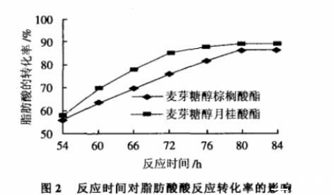 綜合上述實驗結果,以脂肪酶Novozym 435為催化劑,用量為0.24g/mmol脂肪酸,脂肪酸用量為1mmol,麥芽糖醇用量為2.0mmol,溶劑用量為10mL,在60℃條件下反應80h,棕櫚酸和月桂酸的轉化率分別達91%和95%。該結果是本實驗條件范圍內的最好結果。