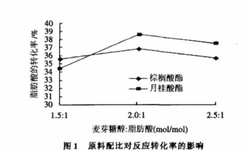 由圖1可知,在原料配比麥芽糖醇:脂肪酸酸分別使用1.5:1、2:1、2.5:1進行反應時,麥芽糖醇:脂肪酸為2:1時,脂肪酸的反應轉化率是最好的,但是,結果相差不大。即在本實驗條件下原料配比對反應的影響較小。分析原因,是因為麥芽糖醇和脂肪酸為互不相溶體系,在反應中,用丙酮做溶劑,即使能建立一個均相的反應體系,由于麥芽糖醇在丙酮中的溶解度比較小,溶液中隨麥芽糖醇的量增加而改變不大。而當麥芽糖醇達到一定用量后,會破壞原有的平衡,導致脂肪酸反應的轉化率降低。所以,反應中選擇麥芽糖醇:脂肪酸的配比為2:1為反應的最佳配比。