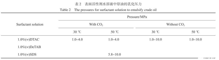 實驗中觀察到原油的乳化情況與體系壓力及CO2存在與否的相關性,表2是CO2存在與CO2不存在條件下,1.0~10.0 MPa范圍內,表面活性劑水溶液中原油的乳化壓力。50℃時,在DTAC水溶液/原油體系中,CO2不存在時,水靜壓在1.0~10.0 MPa范圍內,始終存在原油的乳化現象。CO2存在時,體系壓力低于4.0 MPa時,存在原油的乳化現象,隨著CO2壓力升高,油水界面張力增大,原油乳化現象消失。說明在DTAC水溶液/原油體系中,CO2的存在不利于原油的乳化。50℃時,在SDS水溶液/原油體系中,CO2不存在時,水靜壓從1.0 MPa升高至10.0 MPa過程中,始終未出現原油的乳化現象。CO2存在時,體系壓力升高到5.8 MPa以上,原油開始出現乳化、拉絲的現象。這說明CO2的存在有利于SDS水溶液乳化原油。其原因如下:一方面CO2的存在降低了SDS水溶液與原油的界面張力;另一方面,CO2通過水相擴散進入原油中,降低了原油的黏度,增強了原油的流動性,同時CO2對原油中輕質組分的萃取,也有助于原油中的輕質組分擴散進入水相。因此高壓CO2增強了SDS水溶液對原油的乳化作用。在DeTAB水溶液/原油體系中,油水界面張力較大,無論CO2存在與否,始終沒有原油乳化現象的發生。