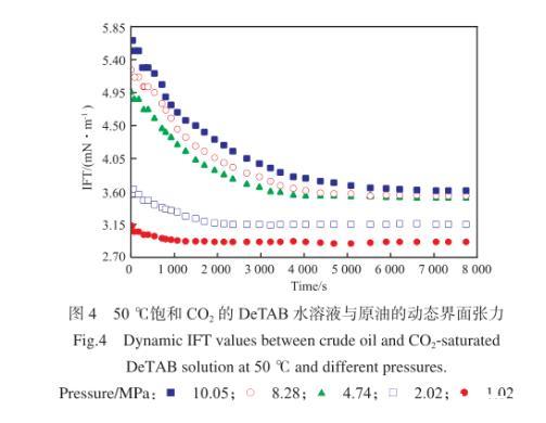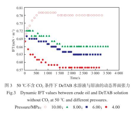 圖3為50℃、不含CO2條件下,DeTAB水溶液與原油的動態界面張力。由圖3可知,在DeTAB水溶液/原油體系中,油水兩相界面張力在初始階段有較大的變化,在接近平衡界面張力時,變化幅度趨于平緩,油水兩相界面張力穩定所需時間在1 500 s左右。