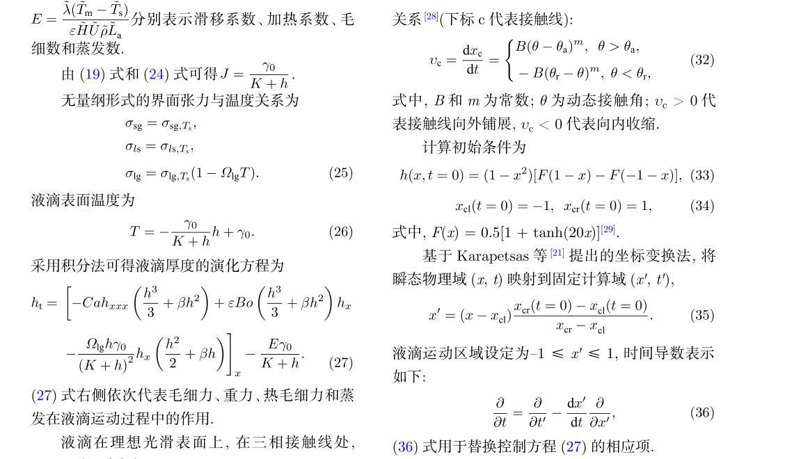 (27)式右側(cè)依次代表毛細(xì)力、重力、熱毛細(xì)力和蒸發(fā)在液滴運(yùn)動(dòng)過程中的作用.