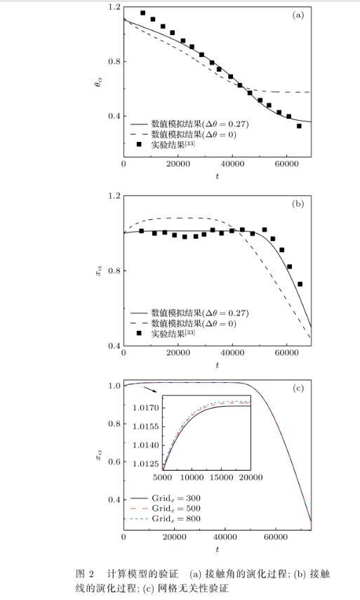 圖2計(jì)算模型的驗(yàn)證(a)接觸角的演化過程;(b)接觸線的演化過程;(c)網(wǎng)格無關(guān)性驗(yàn)證