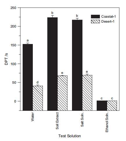 圖 4 水滴滲透時間 (DPT),2:1 w : w 2 小時 用于 Desert-1 和 沿海 1 土壤。 誤差棒顯示重復(fù)的標準偏差 滴。 小寫字母給出了兩側(cè) t 檢驗的結(jié)果。 不同字母表示均值在 P ? 0.01 顯著性水平。
