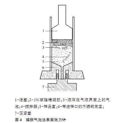 為了避免膜泄漏的出現,Schürch等引入了一種防泄漏的捕獲氣泡法表面張力計。在捕獲氣泡法裝置中(見圖4),待測液體充滿樣品室,樣品室頂部鍍有一親水性瓊脂糖凝膠,從底部進樣口引入的氣泡在浮力作用下上升并緊靠瓊脂糖凝膠層,同時氣泡和凝膠層之間由于液體樣品薄層的阻隔,故不會黏附于凝膠層之上。氣泡的體積通過改變樣品室中的壓力來控制。隨著氣泡體積減小,表面積減小,氣泡表面張力下降。氣泡形狀隨表面張力的變化而變化,從球形到橢圓形。對于初始直徑大于5mm氣泡,當表面張力趨于0時,氣泡呈薄圓盤狀。測量時,通過推動活塞改變樣品室的壓力來控制氣泡體積,并用視頻記錄氣泡體積變化。最后從視頻圖像中測得氣泡的高度和直徑,利用Malcolm等提出的方法計算氣液界面的表面張力、氣泡體積和表面積。