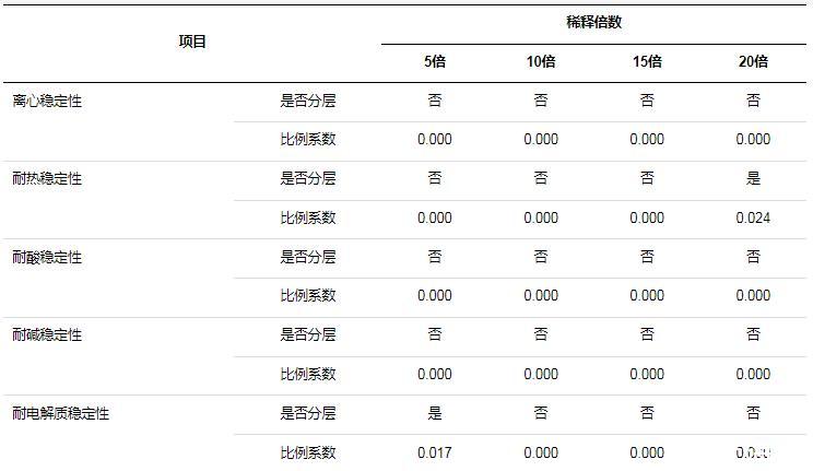 1)經(jīng)過(guò)稀釋后,耐熱穩(wěn)定性、耐電解質(zhì)穩(wěn)定性?xún)蓚€(gè)測(cè)試項(xiàng)目雖然出現(xiàn)分層情況,但是比例系數(shù)均在0.1以下,氨基改性硅油柔軟劑保持較好的穩(wěn)定性;