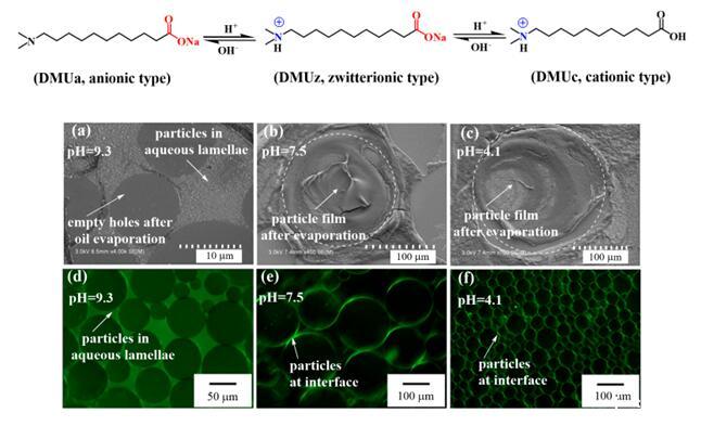 圖2新型頭基電荷可逆轉變型表面活性劑(DMUa)的結構及其(0.5mM)與納米二氧化硅(0.1wt.%)協同穩定的乳狀液的微結構及pH-響應性。(a)和(d)oil-in-dispersion乳狀液,(b)和(e)大油滴Pickering乳狀液,(c)和(f)小油滴Pickering乳狀液