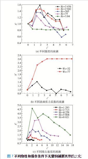 圖7不同物性和操作條件下無(wú)量綱鋪展面積的變化