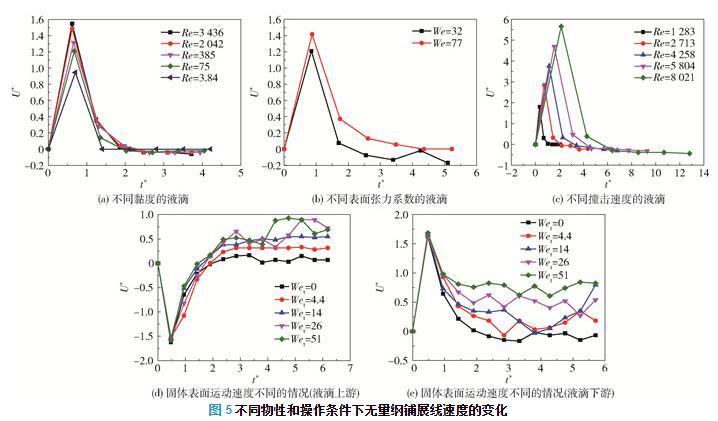 在固體表面水平運(yùn)動(dòng)時(shí),定義液滴上游方向?yàn)橐旱武佌古c固體表面運(yùn)動(dòng)相同的方向,反之為液滴下游方向。如圖5(d)所示,液滴上游鋪展線速度(絕對(duì)值)在撞擊后的短時(shí)間內(nèi)增加到最大值,但由于其方向與固體表面運(yùn)動(dòng)方向相反,隨著固體表面運(yùn)動(dòng)速度的增大,液滴受到的黏性力增大,且上游鋪展線速度降低。液滴上游鋪展線速度降至0之后,黏性力與上游鋪展線速度的方向開始相同,此時(shí)黏性力作正功,因此固體表面運(yùn)動(dòng)速度的增大會(huì)使得上游鋪展線速度增大,直至上游鋪展線速度與表面運(yùn)動(dòng)速度相等。如圖5(e)所示,在撞擊的瞬間,液滴下游鋪展線速度大于表面的運(yùn)動(dòng)速度,此時(shí)黏性力做負(fù)功,且下游鋪展線速度會(huì)逐漸減小至固體表面運(yùn)動(dòng)速度。