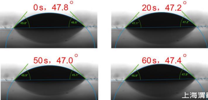 當液體放置在固體表面時,可以直接觀察到其靜態接觸角,當接觸角越小,其潤濕性越好。測試質量分數為1 g/L濃度的C72-MPB和蒸餾水在PTFE表面上的接觸角,實驗結果分別為47°和124°,說明在PTFE上,1 g/L濃度下C72-MPB有較好的潤濕性。觀察C72-MPB液滴形態隨時間變化,如圖6所示。