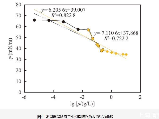 2.1.2三七根提取物的表面張力、臨界膠束濃度、pc20及HLB值