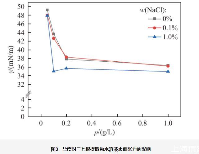 圖3鹽度對三七根提取物水溶液表面張力的影響