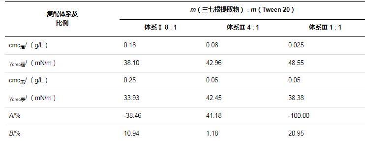 根據Rosen相分離模型,當二元混合表面活性劑復配體系在吸附達到平衡時,溶液相與表面相的化學勢能相等(μ溶=μ表),從吸附達到飽和時溶液相與表面相、膠束相的化學勢能相等(μ溶=μ表=μ膠)出發,推導出復配增效的最佳質量比值約等于各單一組分臨界膠束濃度的比值,即m1∶m2≈cmc1∶cmc2。根據之前的實驗結果,近似地將三七根提取物與Tween 20的復配質量比定為4∶1。