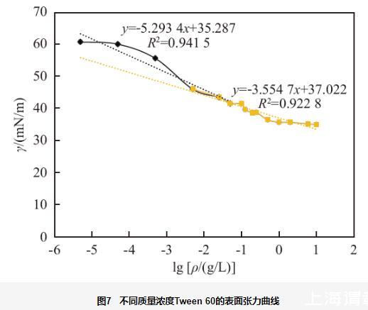測量不同質量濃度的Tween 60水溶液的表面張力,并繪制表面張力(γ)對質量濃度(ρ)的對數曲線如圖7所示。將轉折點兩側的擬合直線外延,相交點為cmc,其質量濃度約為0.1 g/L,對應的表面張力γcmc為41.52 mN/m。