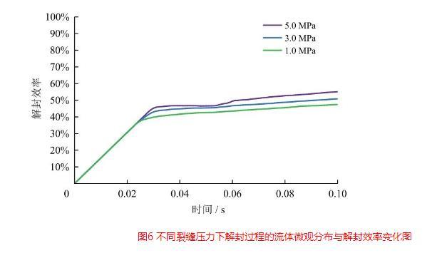 圖6不同裂縫壓力下解封過程的流體微觀分布與解封效率變化圖