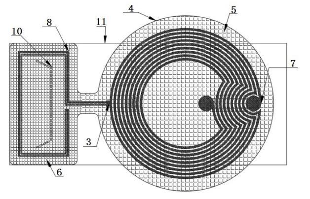 作為本發(fā)明的一種優(yōu)選技術(shù)方案:若射頻芯片為具有偵測(cè)功能的射頻芯片,則由射頻芯片的射頻端口連接布設(shè)于承載基材表面的第一走線,由第一走線在承載基材其中一端的表面上構(gòu)成射頻輻射結(jié)構(gòu),并且由射頻芯片的偵測(cè)端口連接布設(shè)于承載基材表面的第二走線,由第二走線在承載基材另一端的表面上構(gòu)成偵測(cè)結(jié)構(gòu);
