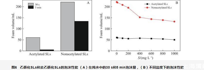 圖6乙?;疭Ls和去乙酰化SLs的泡沫性能(A)在純水中的30 s和5 min泡沫量,(B)不同鹽度下的泡沫性能