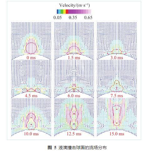 為了研究液滴撞擊高溫球面過程中液滴與氣膜的動力學及傳熱學特性,以液滴撞擊623.15 K球面為例展開模擬,液滴的撞擊速度為0.348 m/s,尺寸為d=1.61 mm,We=8.6.圖4展示了液滴撞擊過程中速度場、溫度場及壓力場的變化,圖5展示了液滴撞擊過程中流場的變化。