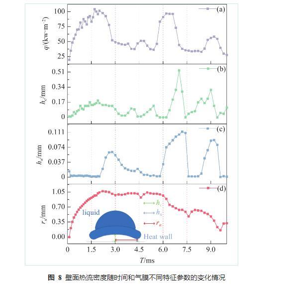 從圖7可以看出,相對于壓強的變化情況,壁面的熱流密度與氣膜的相關性更強,氣膜厚度的變化會引起熱流密度的變化。圖8是液滴撞擊過程中壁面平均熱流密度及氣膜不同特征參數隨時間的變化情況,圖8(a)是壁面平均熱流密度,可以看出,平均熱流密度的變化情況受液滴中心氣膜厚度影響較大,在前期鋪展階段中心氣膜厚度出現明顯波動時熱流密度也相應波動,在液滴收縮階段,熱流密度變化明顯與頸部氣膜厚度成正相關;圖8(b)是液滴中心氣膜高度,中心氣膜高度波動最為劇烈,在液滴撞擊前3 ms內,即液滴鋪展階段先伴隨不穩定波動升高再保持穩定,當液滴開始收縮時出現大范圍的波動;圖8(c)是液滴頸部氣膜厚度,頸部與中心點通常為液滴底部氣膜厚度最薄點,也是熱流密度峰值點;圖8(d)是液滴的頸部半徑長度,它的變化規律與液滴鋪展情況相似,且可以用來表示液滴與壁面的有效換熱面積。相較其他兩項特征參數而言,液滴中心氣膜厚度顯然對熱力學能具有更高的影響。