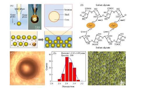 為了實現一步法制備大小均勻、尺寸可控、壁厚可調、生物相容的水/水微囊,需要設計同軸微流控器件,如圖1(A)所示。內相黃原膠水溶液由內管注入微流控器件;外相海藻酸鈉水溶液,由外管注入微流控器件。內相在外相的剪切下形成液滴,同時外相在重力作用下脫離管口生成水包水的水/水微囊,并進一步通過鈣離子交聯海藻酸鈉水凝膠網絡,如圖1(B)所示。由于微流控器件對內外相的精準調控,水/水微囊在光學顯微鏡下具有清晰穩定的核殼結構圖1(C),平均尺寸(D)為(2.83±0.09)mm圖1(D)。該方法制備水/水微囊具有器件結構簡單、操作便捷、一步法成型、微囊尺寸均一可控、核殼結構穩定、無需后處理等優點圖1(E)。