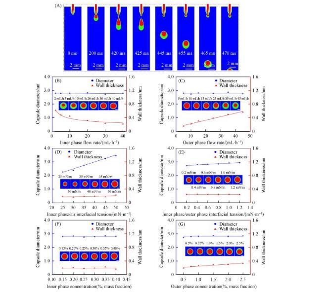 數值模擬與實驗結果具有較好的一致性,數值模擬內相/外相流速對水/水微囊直徑和壁厚的影響,得出了與實驗數據一致的規律,即水/水微囊的直徑基本不隨內相/外相流速的變化而變化,而水/水微囊壁厚隨內相流速增加或外相流速減小都將減小,如圖4(B)和(C)所示。與實驗相比,數值模擬可以更系統地調節各個參數,如外相/空氣界面張力、內相/外相界面張力對微囊直徑和壁厚的影響。隨著外相/空氣界面張力的增加,水/水微囊直徑成比例增加,這是由于外相/空氣界面張力使微囊懸掛在管口,重力使微囊脫離管口,當外相/空氣界面張力增加,需要的重力相應增加,造成水/水微囊直徑增加。當內相/外相界面張力增大時,水/水微囊直徑略有增加。