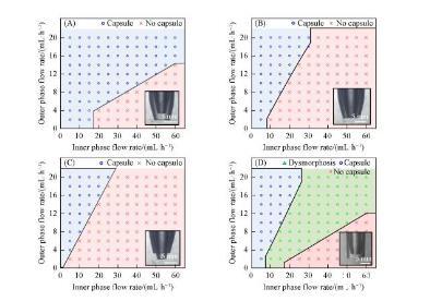 為了深入研究微流控器件結構對水/水微囊成型過程的影響規律,分別制備了內管管口內縮、內外管管口平齊、內管管口伸出、內管管口內縮外管管口不拉伸等4種同軸微流控器件,并通過系統改變內相和外相流速,判斷水/水微囊的成型情況,最終確定水/水微囊的制備相圖,分別如圖2(A)——(D)所示。水/水微囊形成的關鍵是內相在外相的剪切下形成液滴,同時外相在重力作用下脫離管口生成水/水微囊。由于內外相均是水溶液,內相/外相界面張力較小,并且流體黏度較大,內相不容易在外相的剪切下形成液滴,進而被外相包裹形成水/水微囊,因此外相流速增大,對內相剪切加強,更易形成水/水微囊。