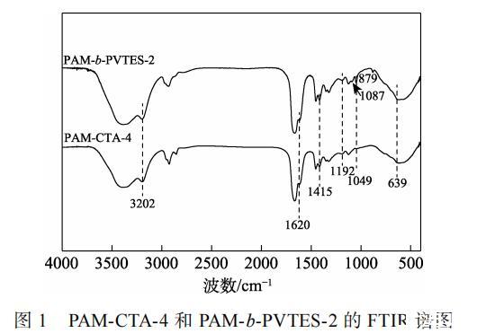 圖1為聚合物的FTIR譜圖。由圖1可知,對于PAM-CTA-4,3202 cm–1處為—NH2的伸縮振動吸收峰,1620 cm–1處為C==O鍵的伸縮振動吸收峰,1192 cm–1處的吸收峰為C—S鍵的伸縮振動,1049 cm–1處的吸收峰為C==S鍵的伸縮振動,1415 cm–1處的吸收峰歸屬于苯環骨架的伸縮振動,639 cm–1處的吸收峰為苯環上單取代的特征峰,表明聚合物PAM-CTA-4已經成功制備。在PAM-b-PVTES-2的FTIR譜圖中,879 cm–1處為Si—C鍵的伸縮振動吸收峰,1087 cm–1處為Si—O鍵的伸縮振動吸收峰,表明聚合物已成功制備。