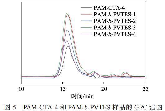 圖5為不同n(VTES)∶n(AM)合成的PAM-b?PVTES樣品的GPC譜圖,結果列于表2。PAM-b?PVTES樣品的相對分子質量分布相較于PAM-CTA-4的相對分子質量分布變大,且隨著VTES用量的增加,聚合物鏈段增長,PAM-b-PVTES的Mw從9058增加到10707。