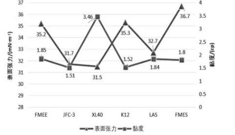 查閱大量文獻(xiàn)發(fā)現(xiàn),大多數(shù)表面活性劑溶液在質(zhì)量分?jǐn)?shù)達(dá)到5%時(shí),其表面張力變化程度保持在穩(wěn)定的數(shù)值。因此本文對表面活性劑溶液按質(zhì)量分?jǐn)?shù)為5%進(jìn)行實(shí)驗(yàn)研究,實(shí)驗(yàn)結(jié)果如圖2所示。