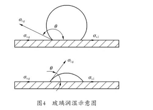 圖4為玻璃潤濕示意圖。如果液體(熔體)和固體間的表面張力很大時(shí),趨向于收縮成球狀以減少兩相界面,潤濕角q也較大,q>90°,稱為液相不潤濕固相;q<90°,稱為液相潤濕固相。