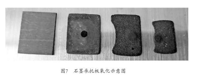 石墨在高溫下易氧化,如圖7所示,氧化會(huì)破壞高純石墨承托板的表面平整度,影響玻璃熔體成球形狀,進(jìn)而影響玻璃液滴體積測量,最終導(dǎo)致表面張力測量誤差。為了避免高純石墨承托板氧化以及玻璃試樣在高溫熔融狀態(tài)下氧化的問題,須在試樣放進(jìn)加熱爐前通入保護(hù)氣,因?yàn)榉菢O性分子對(duì)玻璃熔體表面張力的影響最小,非極性分子有氮?dú)?、氦氣、氫氣等,而氮?dú)饬畠r(jià)且易得,選用氮?dú)庾鞅Wo(hù)氣??紤]到爐管直徑與體積,轉(zhuǎn)子流量計(jì)設(shè)置為1~3 L/min,大致能夠滿足每分鐘3~10倍的氣體置換,使?fàn)t內(nèi)形成正壓,氧氣不會(huì)滲入爐內(nèi),防止石墨承托板氧化,保護(hù)氣體充滿整個(gè)加熱爐的同時(shí)不會(huì)氣流過大,將試樣吹落。