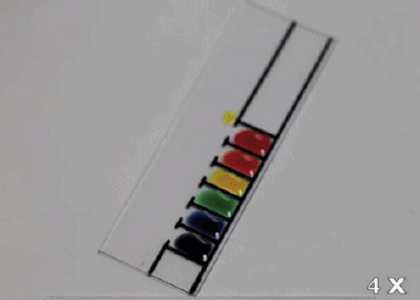 這個難度比較高,不過現(xiàn)象非常有意思。在這里使用的是含有丙二醇和水的液體食品色素,這些液滴經(jīng)過不同程度的稀釋。在非常潔凈的玻璃片上,它們因為蒸發(fā)而產(chǎn)生表面張力的變化,從而出現(xiàn)彼此“追逐”的現(xiàn)象。詳情: