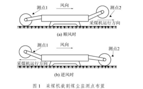為研究大采高綜采工作面截割煤塵分布特征,分別在采煤機前后滾筒附近布置煤塵監測點,測量順風情況下和逆風情況下大采高綜采工作面PM10,PM5,PM2.5的粉塵質量濃度,測點布置如圖1所示。測量時采煤機運行至工作面中部,即前后兩滾筒分別在65號和75號支架附近,測點布置沿風流風向依次布置,因此在順風情況下,測點1位于采煤機后滾筒附近,測點2位于采煤機前滾筒附近;逆風時,測點1位于采煤機前滾筒附近,測點2位于采煤機后滾筒附近。測量儀器選用SidePak AM520i型個體暴露粉塵儀。該儀器可實時顯示并記錄PM10、PM5、PM2.5質量濃度。