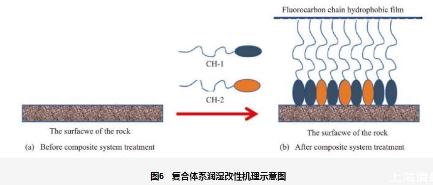由圖5可看出,隨著表面活性劑濃度的增加,3種體系對應的接觸角均先增大后降低最終趨于平衡;陽-非離子復合表面活性劑體系的潤濕改性效果最好,可使模擬地層水在石英片表面上的接觸角由23.0°增至108.0°,使凝析油在石英片表面上的接觸角由36.0°增至102.0°;石英片經CH-1或CH-2處理后,模擬地層水在石英片表面的最大接觸角分別為101.8°或97.7°,凝析油在石英片表面的最大接觸角分別為97.2°或94.5°。這是因為陽離子表面活性劑分子與非離子表面活性劑分子間存在復配協同效應。圖6為復合表面活性劑體系潤濕改性機理示意圖。由圖6可看出,陽離子表面活性劑分子與非離子表面活性劑分子構成的混合聚集體與砂巖表面羧酸類物質形成離子對的驅動力為靜電引力、氫鍵、范德華力的共同作用力,作用效果遠大于單一的靜電引力、氫鍵及范德華力。這些共同作用力使復合表面活性劑在界面上的吸附能力通常比單一表面活性劑更強。陽離子表面活性劑和非離子表面活性劑可同時或交替地吸附在固體表面,形成更緊密、更穩定的吸附層,這種吸附層可以改變固體表面的性質,使其更疏水疏油。