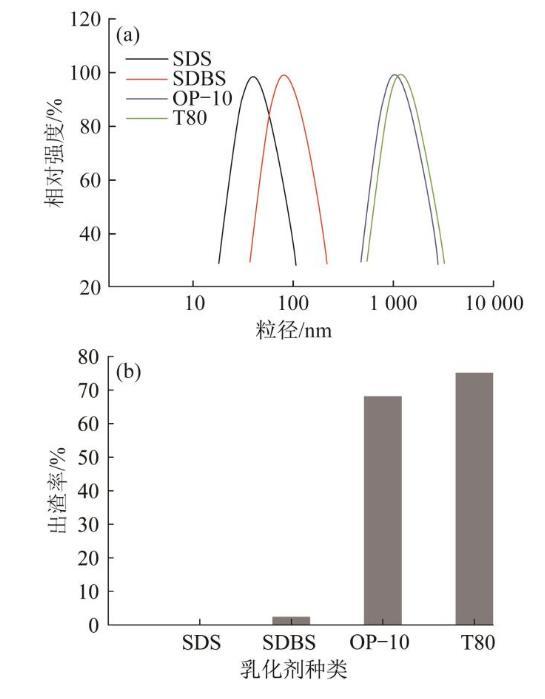 圖1乳化劑種類(lèi)對(duì)產(chǎn)品粒徑中值(a)和出渣率(b)的影響