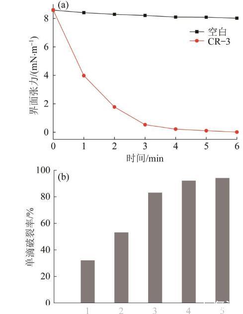 圖2界面張力(a)與單滴破裂率(b)隨時(shí)間的變化