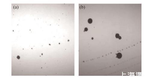 圖3加反相破乳劑前(a)、后(b)含油污水顯微照片對(duì)比