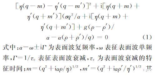 式中:α=ω±iΓ為表面波復(fù)頻率,ω表征表面波單頻率,Γ=1/τc表征表面波衰減,τc為表面波衰減的特征時(shí)間;m=(q2+iαρ/η)1/2,m′=(q2+iαρ′/η′)1/2,其中未知參數(shù)q、η、η′、ρ、ρ′分別為表面波波數(shù)、液相黏度、氣相黏度、液相密度、氣相密度;σ為表面張力。