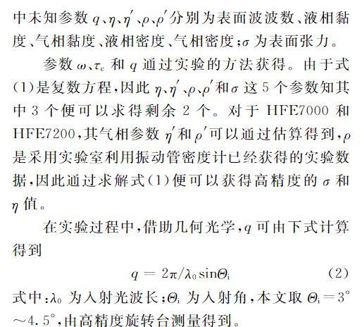 參數(shù)ω、τc和q通過(guò)實(shí)驗(yàn)的方法獲得。由于式(1)是復(fù)數(shù)方程,因此η、η′、ρ、ρ′和σ這5個(gè)參數(shù)知其中3個(gè)便可以求得剩余2個(gè)。對(duì)于HFE7000和HFE7200,其氣相參數(shù)η′和ρ′可以通過(guò)估算得到,ρ是采用實(shí)驗(yàn)室利用振動(dòng)管密度計(jì)已經(jīng)獲得的實(shí)驗(yàn)數(shù)據(jù),因此通過(guò)求解式(1)便可以獲得高精度的σ和η值。