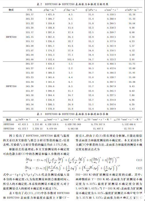 本文對HFE7000和HFE7200在飽和狀態下293.17~393.00 K和293.27~393.35 K溫度區間的表面張力和黏度進行了實驗研究,結果列于表2。