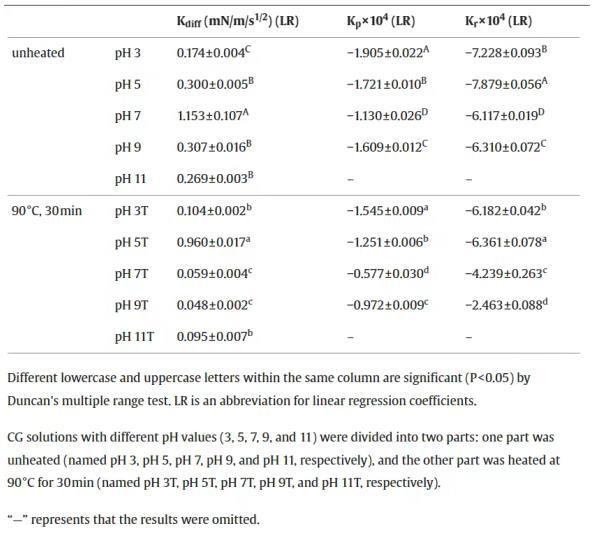 Kdiff、Kp和Kr的最高值分別為pH值7、3和5。柔性蛋白可以在油水界面上更快地吸附和重新排列。pH為3時CG靈活的二級結構,使其具有更好的吸附動力學,。pH 5(接近pI 4.3)的CG更弱的靜電斥力,引起了更好的結構重排。加熱后,除pH值為5時CG的Kdiff外,所有樣品的Kdiff、Kp和Kr均有所下降。加熱后的CG具有較低的初始界面張力和較短的平衡吸附時間(圖1a),它能迅速達到平衡狀態,并且吸附動力學指數較低。此外,加熱后的CG表現出顯著的變性和聚集,殘留的蛋白質分子會產生空間位阻,從而阻礙聚集后的CG到達油水界面。此外,不溶性CG聚集體對殘留CG分子的吸附產生了屏障。CG在pH為5時,蛋白質形成大量沉淀,溶解度僅為12.05%??扇苄缘鞍缀康鸵馕吨^弱的靜電排斥力,這使剩余的蛋白更容易擴散,從而導致最高的Kdiff。與動態界面張力相比,CG與pH 5T的吸附動力學不受蛋白質濃度的影響。