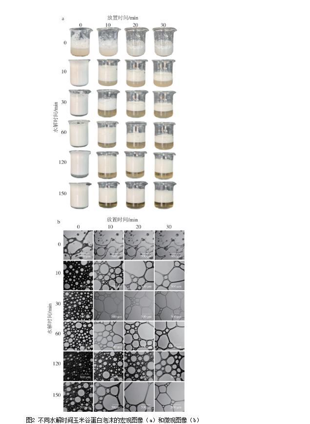 圖2不同水解時間玉米谷蛋白泡沫的宏觀圖像(a)和微觀圖像(b)