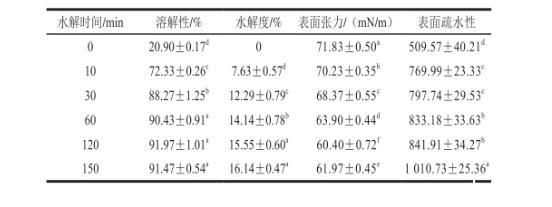 表1水解時間對玉米谷蛋白溶解性、水解度、表面張力和表面疏水性的影響