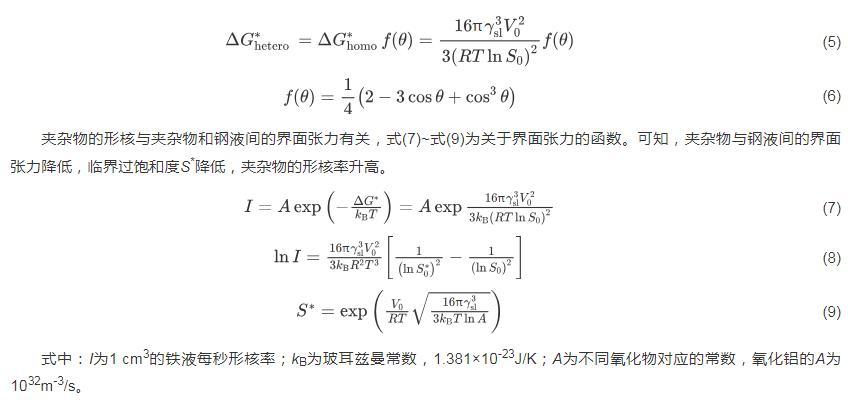 夾雜物的形核與夾雜物和鋼液間的界面張力有關,式(7)~式(9)為關于界面張力的函數。可知,夾雜物與鋼液間的界面張力降低,臨界過飽和度S*降低,夾雜物的形核率升高。