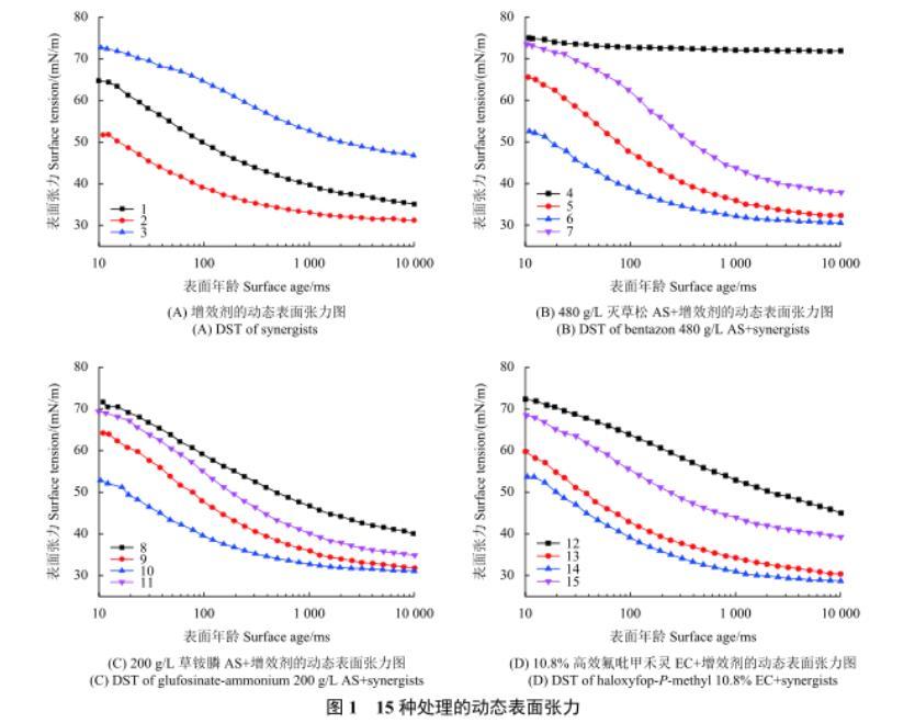 圖1 15種處理的動態表面張力