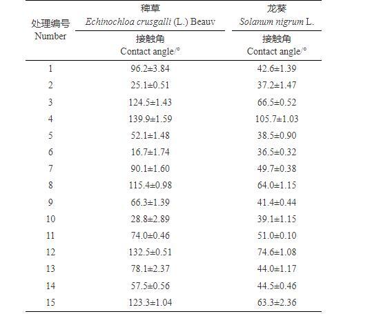 1.2.4接觸角測定選取新鮮且潔凈的均為6葉期的稗草和龍葵葉片,避開葉脈和病斑,選取平整部分剪取小塊的葉肉,滴加5μL待測樣品,10 s后記錄接觸角大小,至少重復3次,計算平均接觸角。