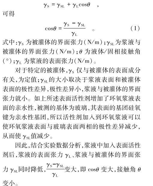 對于特定的被灌體,γS僅與被灌體的表面成分有關,為定值;γSL的大小取決于漿液表面和被灌體表面的極性差異,極性差異小,漿液與被灌體的界面張力就小。如上所述表面活性劑增加了環氧漿液表面的親水性,被測的基體為玻璃,其表面的基團硅氧鍵為親水性基團,所以活性劑加入到環氧漿液可以使環氧漿液表面與玻璃表面兩相的極性差異減少,從而使γSL值減少。