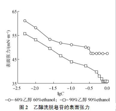 60%乙醇溶液洗脫得到皂苷的得率為39.03%,90%乙醇溶液洗脫得到皂苷的得率為5.01%。由圖2可知,60%乙醇溶液洗脫得到的皂苷臨界膠束濃度為0.35 g/L,最低表面張力為47.43 mN/m;而90%乙醇溶液洗脫得到的皂苷臨界膠束濃度為0.75 g/L,最低表面張力為35.83 mN/m??梢钥闯觯?0%乙醇洗脫得到的皂苷臨界膠束濃度更高,最低表面張力更低。說明苷元含量越高,其臨界膠束濃度越大,最低表面張力越小。