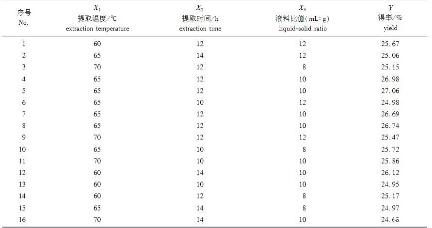 通過軟件分析得到肥皂莢皂苷的最優(yōu)提取條件為:溫度69.20℃、時(shí)間11.28 h、液料比值9.89,皂苷得率的預(yù)測值為26.44%。為了操作方便,修正提取條件為:溫度69℃、時(shí)間11 h 15 min、液料比值為10。在此條件下對肥皂莢皂苷進(jìn)行水浸提,并做3次重復(fù)性實(shí)驗(yàn),平均得率為26.49%,與理論值誤差僅為0.05%。表明該模型可以較好地預(yù)測肥皂莢皂苷的提取工藝。