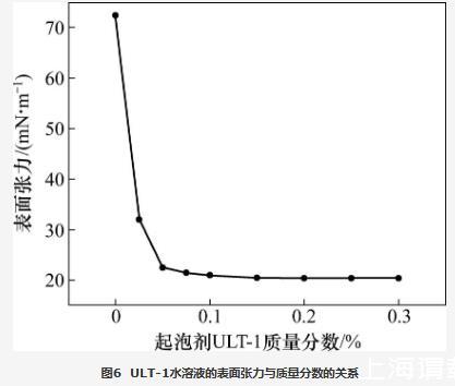 當起泡條件相同時,起泡劑水溶液的表面張力越低,發泡體積越高。配制一系列濃度梯度的起泡劑ULT-1水溶液,利用接觸角/表面張力測量儀采用懸滴法測量表面張力與起泡劑ULT-1質量分數的關系,結果如圖6所示。從圖6可知:當起泡劑ULT-1質量分數小于0.05%時,表面張力隨起泡劑ULT-1質量分數的提高快速降低;當起泡劑ULT-1質量分數大于0.05%時,表面張力降幅越來越??;當起泡劑ULT-1質量分數提高至0.2%時,表面張力降至20.40 mN/m,較蒸餾水降低了71.82%,繼續提高起泡劑ULT-1的質量分數,表面張力不再降低。表明新型起泡劑ULT-1在較低濃度時即達到較低的表面張力,有利于提高發泡體積。